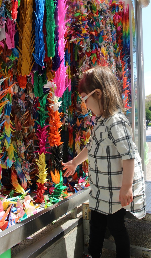 Outside of the exhibition hall, volunteers help us make origami cranes, a gesture of peace and goodwill. Perhaps this act of creation will be the balm for my melancholy today. My husband guides our daughter’s hands, helping her crease, turn, and tuck. Rose petal lips press gently against the bottom of the crane, little puffs of air breathing life into the paper form. Hand-in-hand with her daddy, my daughter carries the persimmon-colored bird toward the Children’s Monument. Gratitude and grief swirl and swell in my chest as I watch them walk together. What will we tell our children about Hiroshima?