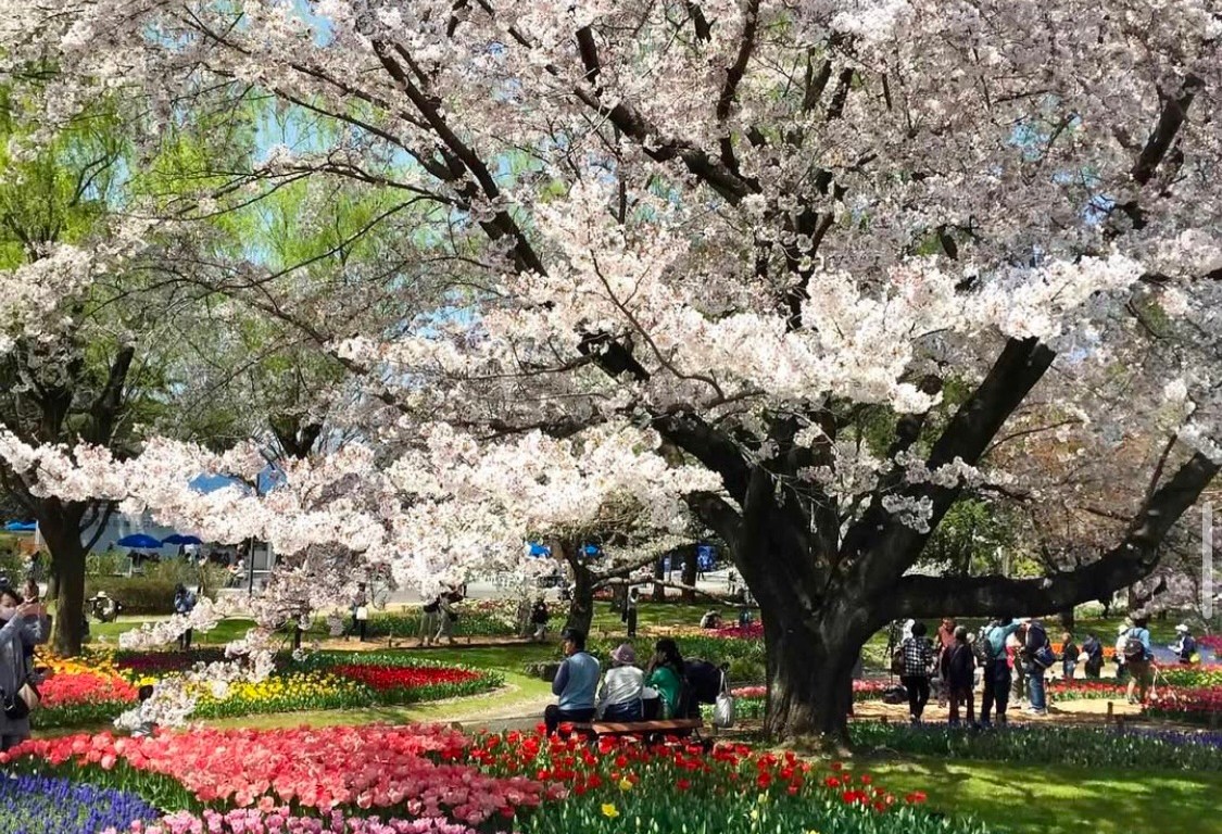 By late March, the buds start to open, revealing delicate pink and white petals. We hop in the van and drive toward Show Kinen Park, stopping on the way to pick up a conbini lunch of fried chicken, nigiri, and egg salad sandwiches. We walk familiar paths to a grassy field surrounded by trees heavy with blossoms–an ideal spot for hanami.